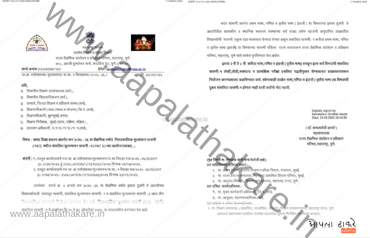 समग्र शिक्षा प्रकल्पांतर्गत महाराष्ट्र राज्यातील शाळांसाठी एक महत्त्वपूर्ण घोषणा करण्यात आली आहे. सन २०२५-२६ या शैक्षणिक वर्षासाठी नियतकालिक मूल्यांकन चाचणी (Periodical Assessment Test – PAT) चे नियोजन जाहीर झाले असून, यामधील संकलित मूल्यमापन चाचणी-१ (PAT 2) बाबत सविस्तर सूचना प्रसिद्ध करण्यात आल्या आहेत.